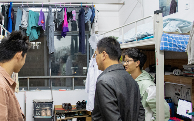 检查组一行还先后来到南区8栋(研二)、10栋,对大二学生宿舍进行突检,了解他们的学习生活状况。各宿舍卫生安全情况良好,没有发现脏乱差现象和违规电器、管制刀具等,绝大多数同学都在看书学习、也有极个别用手机玩游戏的。检查组叮嘱同学们要自觉注重良好的学习生活、卫生安全习惯的养成,珍惜大学时光,做好学业规划;严格遵守学校和学院各项规章制度,注意用电和财产安全,严禁使用违规电器;室友之间要相互帮助、关心、包容,同心协力营造和谐互助友爱的寝室环境。