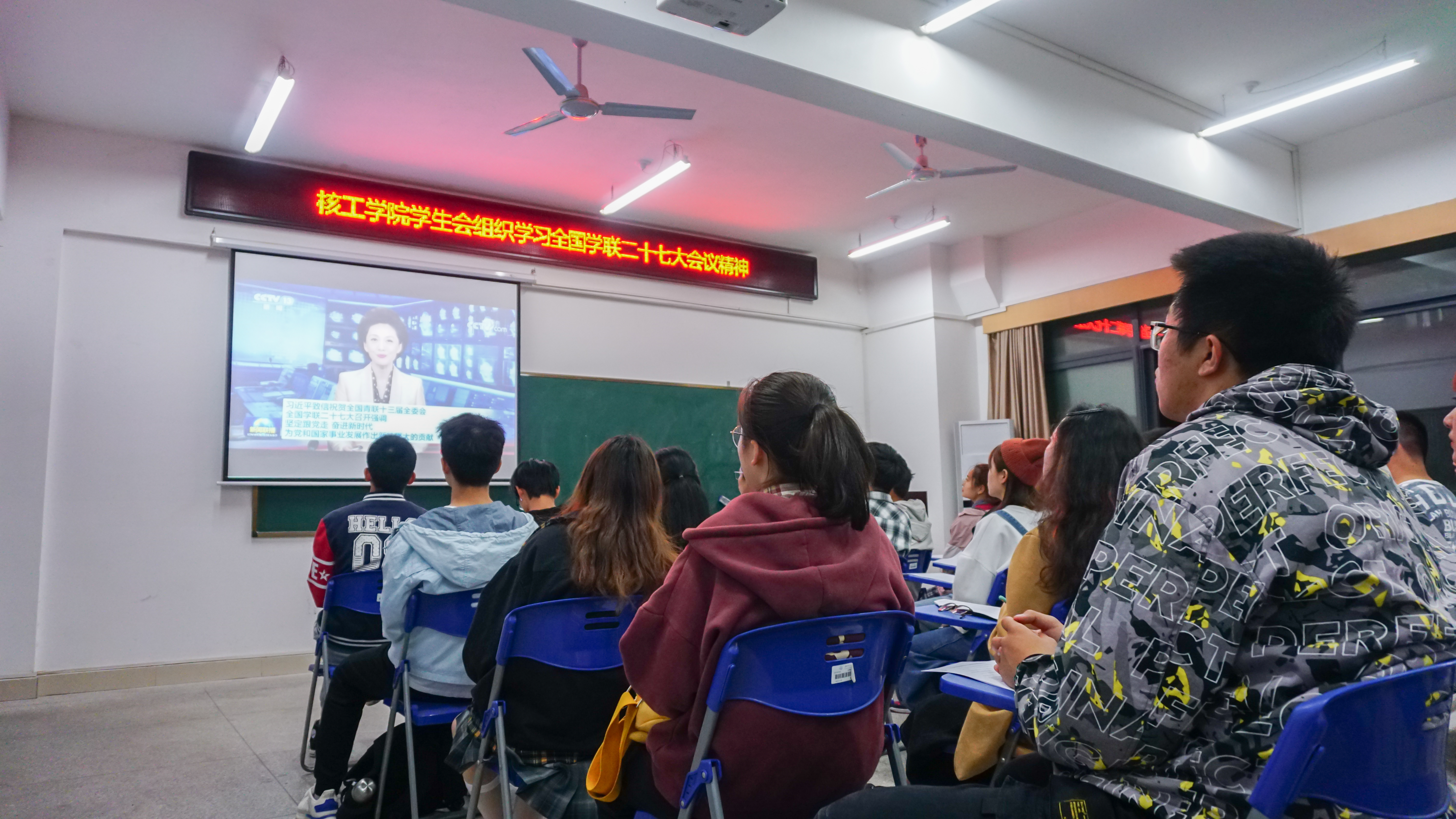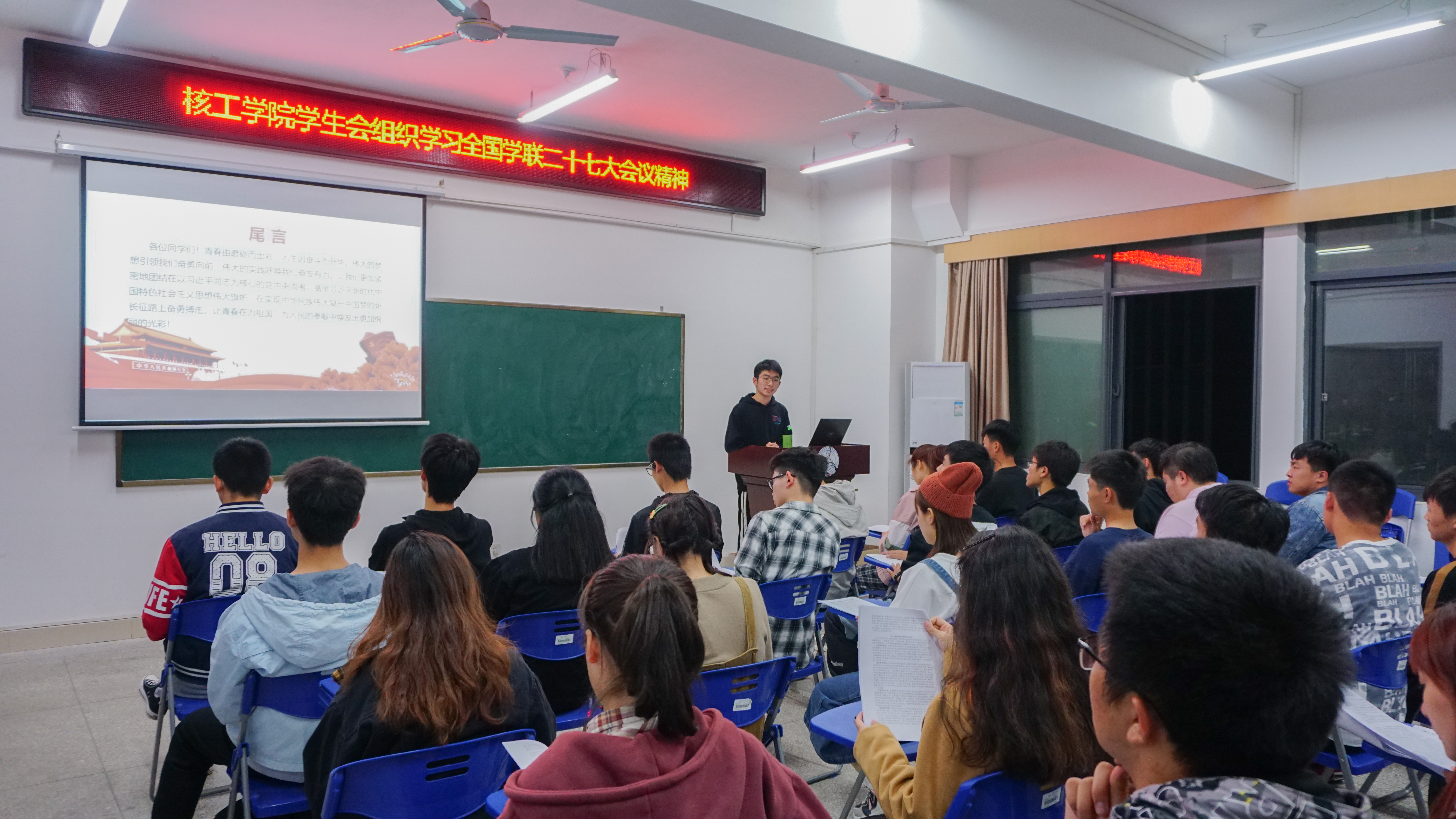 为贯彻落实全国学联二***会议精神,引导青年团员、学生干部坚定理想信念,坚定跟党走,奋进新时代,11月13日,核科学与工程学院学生会在地学楼C503教室组织开展了以“坚定跟党走 奋进新时代”为主题的学习活动,全体学生干部参加了学习。活动由院学生会执行主席胡政豪主持。