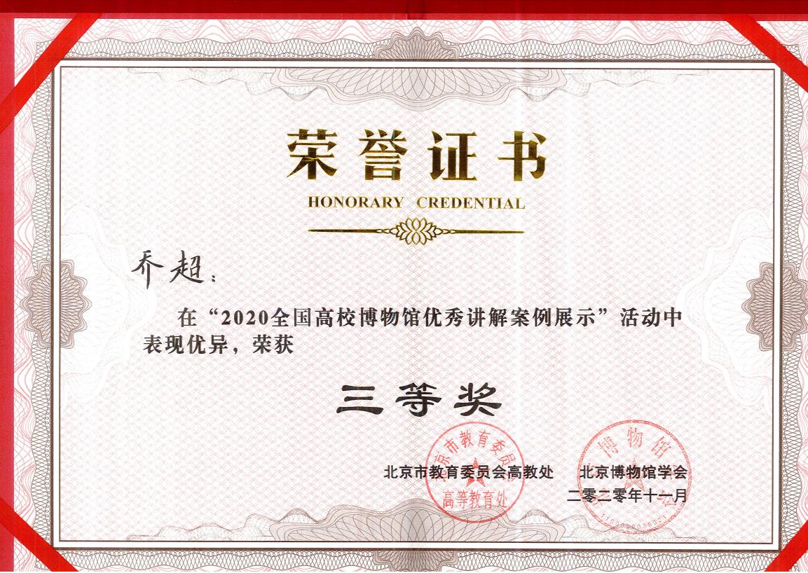 2020年11月27日,由国家文物局、中国博物馆协会指导,北京市教育委员会、北京市文物局、北京博物馆学会、中国传媒大学、中国地质大学(北京)主办的“第六届中国高校博物馆馆长论坛暨2020年全国高校博物馆优秀讲解案例展示颁奖仪式”在中国传媒大学召开。我校地球科学学院2019级学生乔超在彭花明教授的悉心指导下,通过线上线下双向比赛、层层过关,最终荣获三等奖。