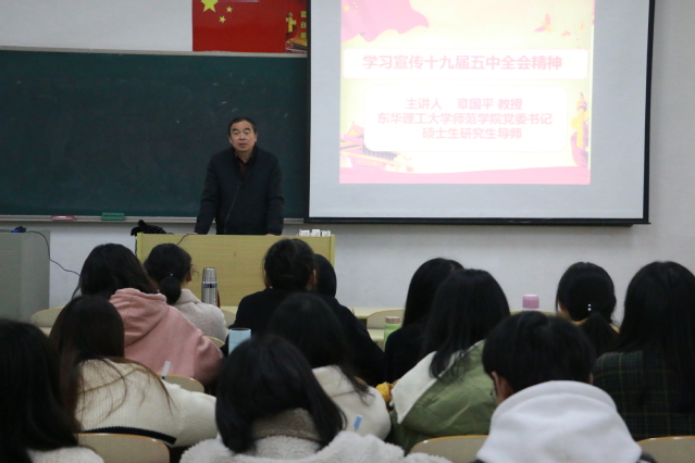 培训中,章国平以《党的十九届五中全会精神解读》为题,从“新时代”的含意和划分、五中全会“四个全面”发展战略布局的变与不变、“十四五”中国经济社会发展主要目标的六个“新”和全会公报的十四个“关键词”等五个方面,联系国际国内形势、师生学习生活实际和抗击新冠肺炎疫情斗争重大战略成果进行了解读。他指出同学们身为新时代的亲历者、见证者和建设者,要进一步增强四个自信,树立报效祖国的远大理想,珍惜时代赋予青年的使命与责任。