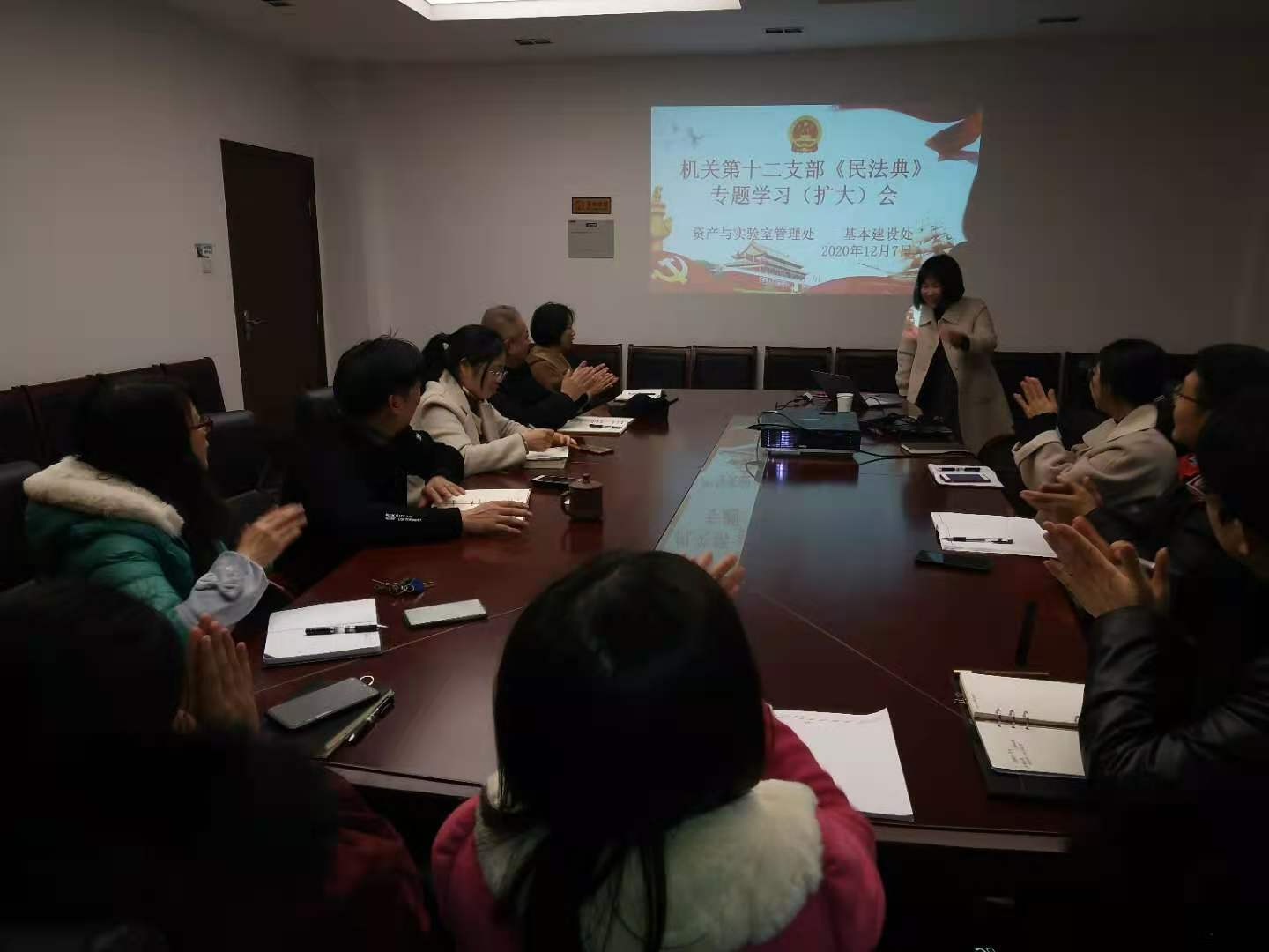 12月7日,机关第十二党支部在行政楼201会议室组织开展《民法典》专题学习活动。资产处处长徐季丹、基建处处长李江、统战部副部长邓红珍及资产处、基建处全体老师参加专题学习(扩大)会。
