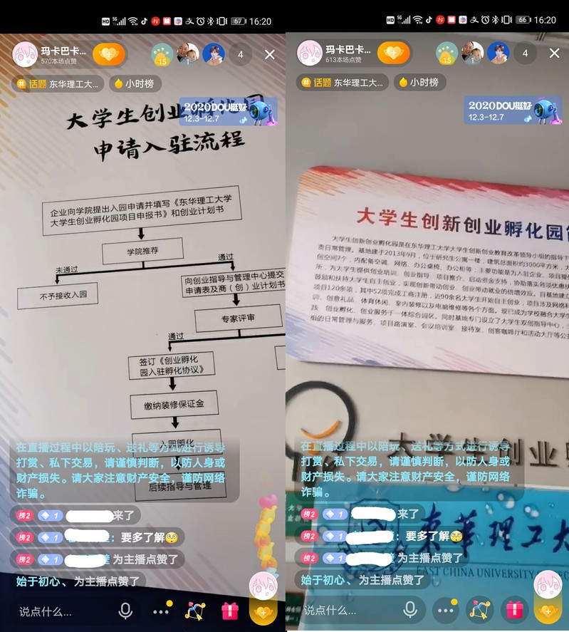 活动中,荣获人民优选直播大赛江西赛区一等奖的人气主播吴熹以直播视角带领大家“云参观”学校大学生创业孵化基地,不但带大家亲眼目睹了大学生创业孵化园场地设置、服务设施、在孵项目成员工作情况,还介绍了学校鼓励大学生创新创业的优惠政策,重点还对疫情下学校对大学生创新创业的一系列鼓励措施展开了细致而深入的介绍。直播中,大学生创新创业指导中心的学生干部全程在线解答同学们的提问,主播对在孵项目成员的采访也让更多学生了解了在校大学生创新创业的积极状态。