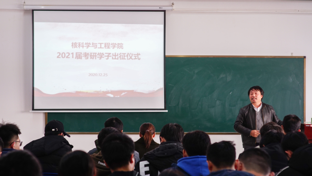 2020年12月26-27日是2021年全国硕士研究生招生的考试时间。为了给考研学子送上祝福、加油鼓励,引导他们沉着应对、坚定信心,12月25日上午,核科学与工程学院在地学楼C503会议室举行了“2021届考研学子出征仪式”。院党委书记余斌、院长刘义保、党委副书记刘顺祥、副院长李小燕,全体辅导员、17级部分班主任及考研学子参加仪式。仪式由院团委负责人欧阳威老师主持。