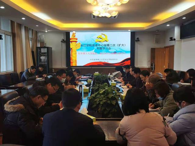 2021年1月13日下午,长江学院党委在行政楼三楼会议室召开党委中心组第二次(扩大)专题学习会,专题学习东华理工大学党委一届九次全会精神。学院领导班子成员、党委委员、科级以上干部参加了会议,会议由学院党委书记陈泉水主持。