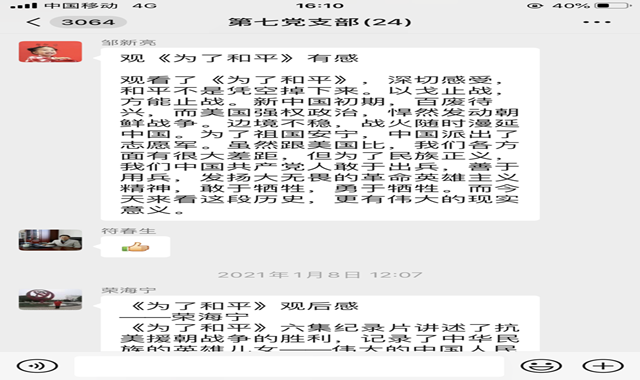 退休七支部书记荣海宁:观看《为了和平》后,我深刻认识到,没有任何力量能够撼动我们伟大祖国的地位,没有任何力量能够阻挡中国人民和中华民族的前进步伐。我们退休老同志在习总书记领导下,每一位党员都必须和党中央保持一致,弘扬伟大的抗美援朝精神,做世界和平的维护者。