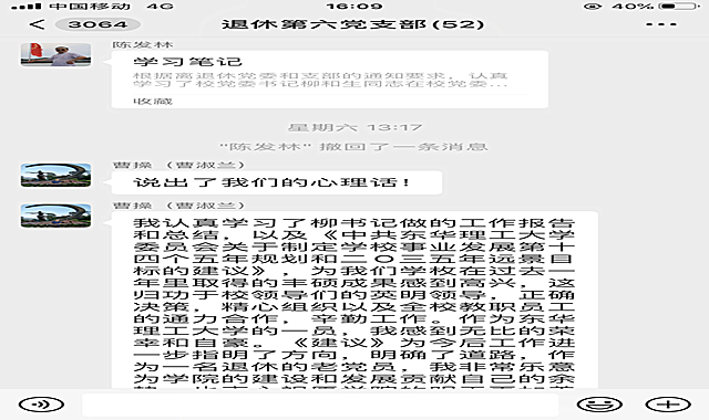 退休六支部支委陈发林:认真学习了柳书记的讲话、孙校长的报告,深受鼓舞。作为一个老同志,深切感受到,学校的发展始终与我们的切身利益息息相关。在建党100周年来临之际,办成了许多象广兰校区家属区天燃气管道安装、供水管道和表前供电线路升级改造、东侧道路拓宽改造、安装了户外健身器材、为离退休老同志每月增加生活补助等关系老同志安全与生活福利方面的大好事。