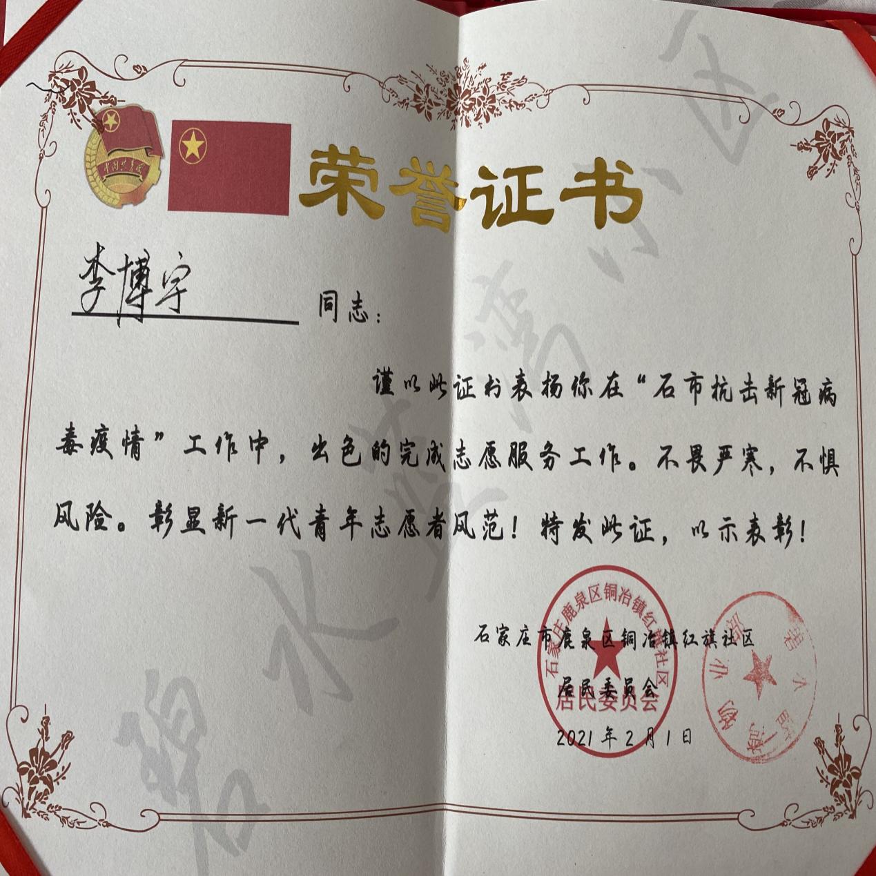 2021年1月初,新冠疫情在河北石家庄突然蔓延。面对疫情,我院2018级学子李博宇奋勇争先,积极报名成为了石家庄抗疫志愿者一员,并开始了为期半月之久的志愿者行动。