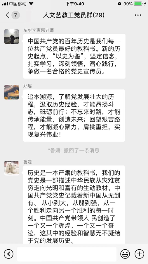 “中国共产党的百年历史是我们每一位共产党员最好的教科书。新的历史起点,以史为鉴,坚定信念,扎实学习,深刻领悟,潜心践行,争做一名合格的党史宣传员。”教工党员李惠惠表示。