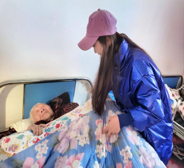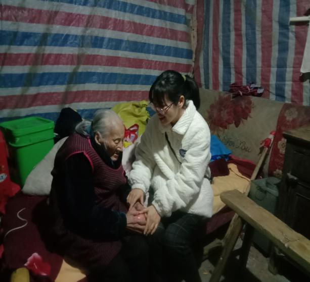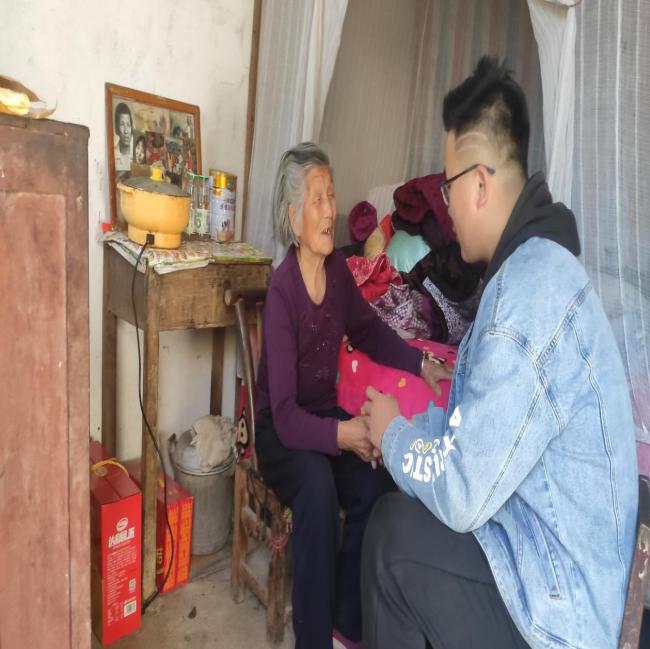 江苏籍学生陈奉明去到当地养老院看望老人;江西籍学生李姝姣看望留守老人