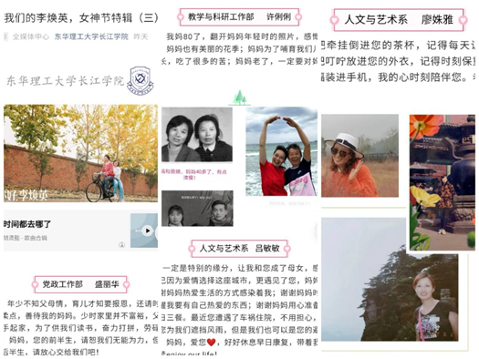 院工会精心整理教工们发来的照片和祝福话语,编辑3期《是我们的李焕英,女神节特辑》,在学院官方微信公众号发布,转达教工们对妈妈浓浓的爱意和最真挚的节日祝福。