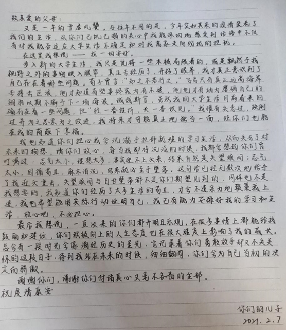 我院2020级学生积极参与“写一封平安家书”、“做一份学业规划”、“拍一张幸福照片”、“写一幅书法作品”、“开展一次志愿服务”和“准备一顿丰富美食”等活动。通过“平安家书”活动,傅茵茵同学、张鑫同学和尹一凡同学用书信表达他们对父母的孝心、抒发感恩之情。为提高学生自主学习意识和能力,营造良好的学风,我院积极宣传学业规划的重要性。本次我院共收集45份学业规划书,通过进一步筛选,共选出12份优秀作品递交学工处参加学校比赛。寒假期间,我院多名同学助力地方疫情防控,受到中国新闻网、中国教育在线、江西新闻网等多家媒体报道。此外,我院还收到了同学们拍的幸福照片、书法作品、和“最美小厨”等作品。