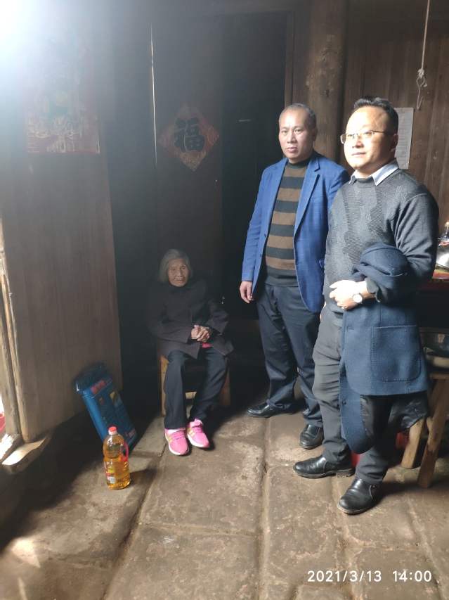 冒着连绵的细雨,学院师生首先慰问徐家村里面的困难群众,学院党委书记吴小龙和院长那兵将慰问品一一送到困难群众手中。特困供养户李茶英是徐家村出名的困难户,李奶奶现已92岁高龄,无儿无女,平时就她一人独自生活,学院领导亲自将慰问品送到李奶奶家中。一到李奶奶家,因近日阴雨连绵,房屋内外青苔泛滥导致地面湿滑,学院杨璇和贾海英老师二话不说直接带领学生党员铲除青苔撒上炉灰,一时间屋内屋外人潮涌动好不热闹,李奶奶也笑的合不拢嘴。