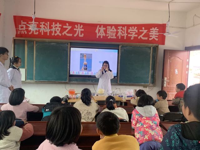 中午,久违的阳光刺破厚厚的云层,洒满了徐家小学的操场。学院学生志愿者早早来到徐家小学的多媒体教室,搬板凳、拉横幅、放资料……迎接着孩子们的到来。陆陆续续地,村里面孩子们聚拢过来,带着一点点羞涩、一丝丝好奇,等待着化学实验趣味课堂开讲。