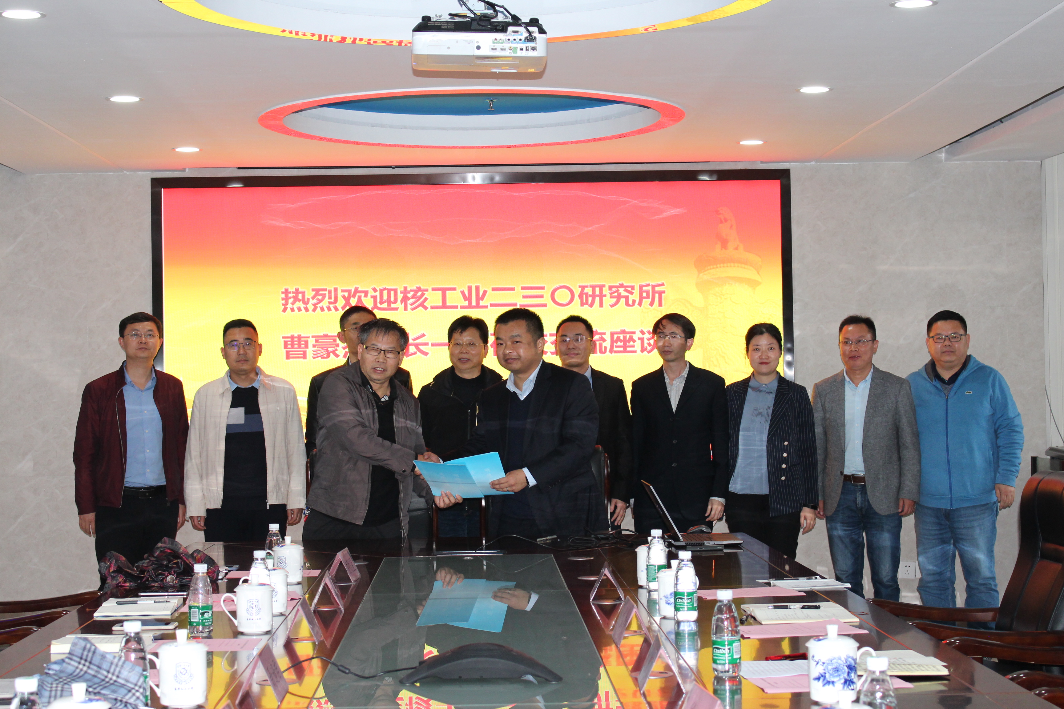 3月16日,核工业二三〇研究所所长曹豪杰、副所长徐浩、科技质量部主任欧阳平宁、分析测试中心副主任朱姝一行来核资源与环境国家重点实验室调研、座谈、并签署合作协议。副校长聂逢君教授、科技处副处长刘帅教授、实验室常务副主任潘家永教授、副主任周义朋教授、冷成彪教授等二十余人参加了座谈会。