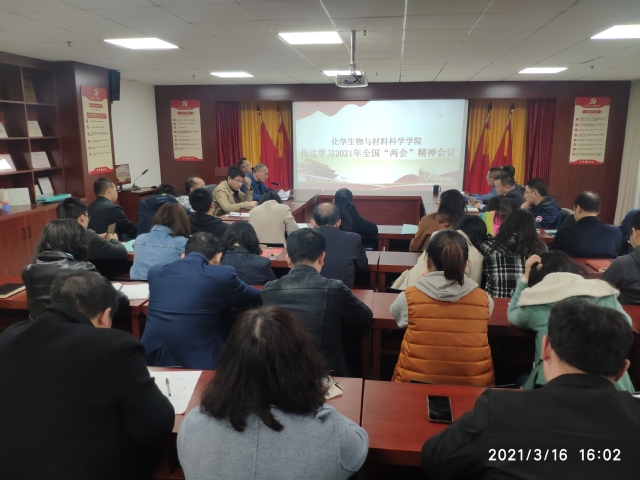 3月16日,化学生物与材料科学学院召开党委中心组第3次学习(扩大)会,专题传达学习贯彻习近平总书记在全国“两会”上的重要讲话精神,传达学习贯彻十三届全国人大四次会议精神、全国政协十三届四次会议精神和栗战书委员长参加江西代表团审议时的讲话精神。学院党委委员、科级以上干部、党支部书记、师生党员代表参加会议,学院党委书记吴小龙主持会议。