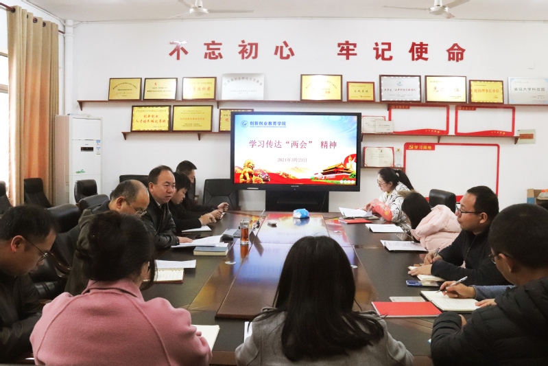 3月23日下午,创新创业教育学院在学院308会议室召开专题会议,学习传达2021年全国“两会”精神,并就扎实落实好“两会”精神进行部署要求。学院全体教职工参加会议,会议由学院党总支书记王合义主持。