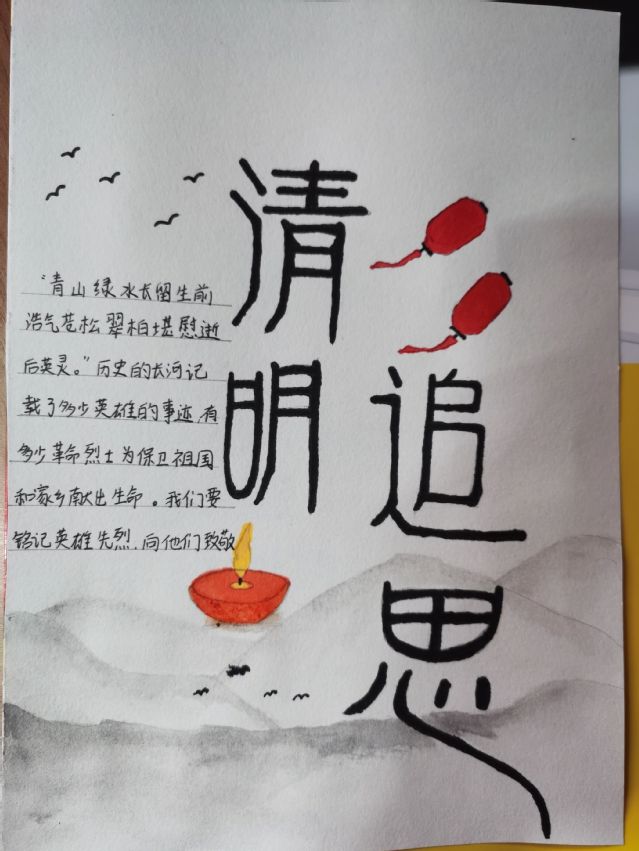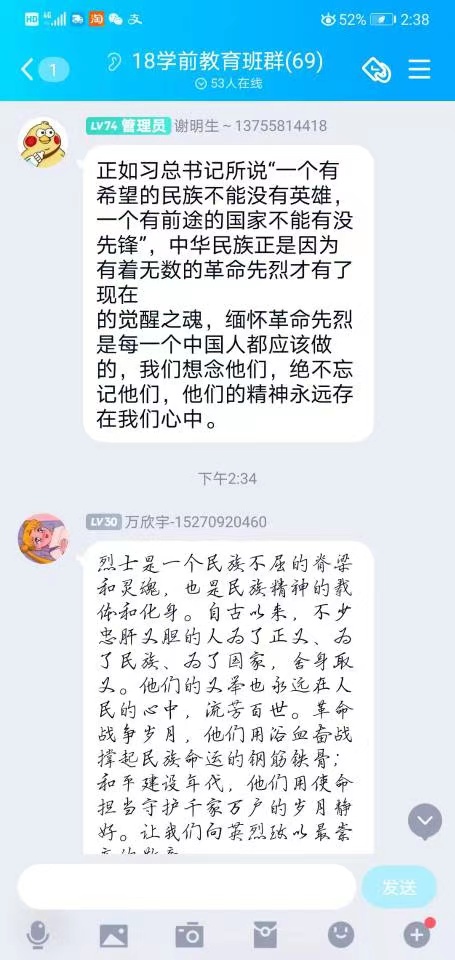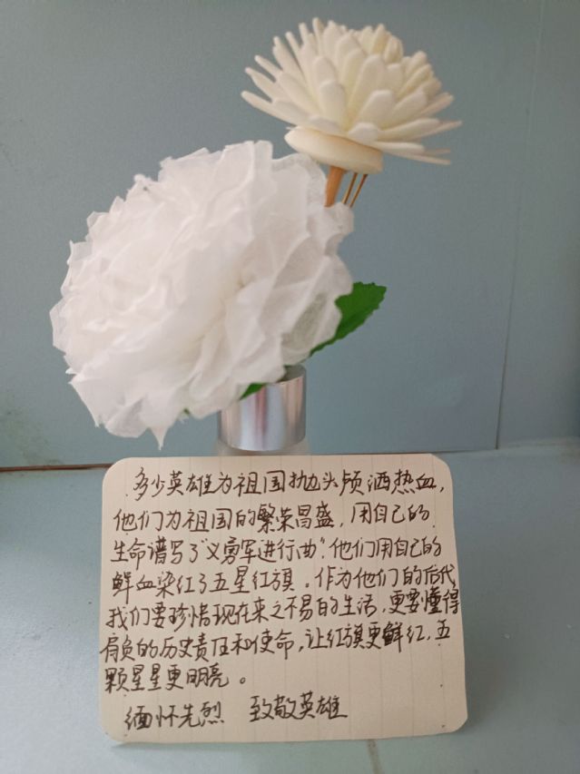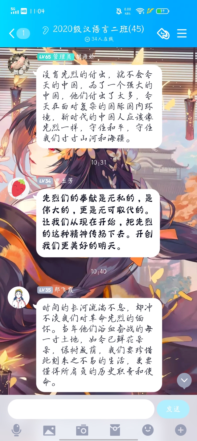 上午10点,各团支部在班级QQ群组织同学进行了线上祭奠活动。活动伊始,团支书深情地朗读悼文,叙述着百年来革命英烈为追求民族独立、民族解放、人民幸福而用生命抒写的壮丽人生篇章。接着,全体同学默哀。随后,大家献上了精心制作的手工思念卡和小白花,向英雄先烈们表达了缅怀,同学们纷纷发表对此次活动的感悟。