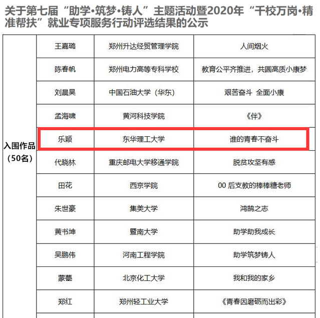 近日,第七届“助学·筑梦·铸人”主题活动暨2020年“千校万岗·精准帮扶”就业专项服务行动公布了评选结果,我校2019级测绘科学与技术专业研究生乐颖提交的短视频参赛作品《谁的青春不奋斗》成功入围。据悉本次活动从全国高校收到的55915份各类作品中,评审出入选作品210份,其中短视频类共评选出优胜作品5份,优秀作品25份,入围作品50份。