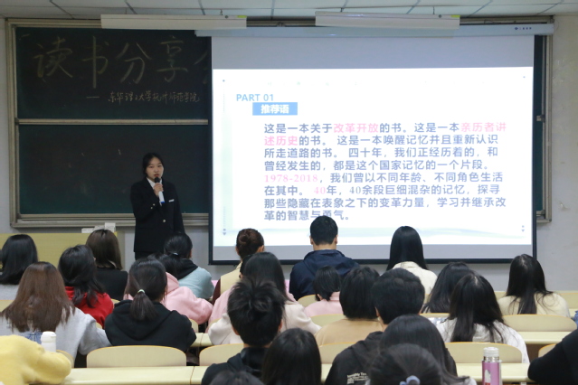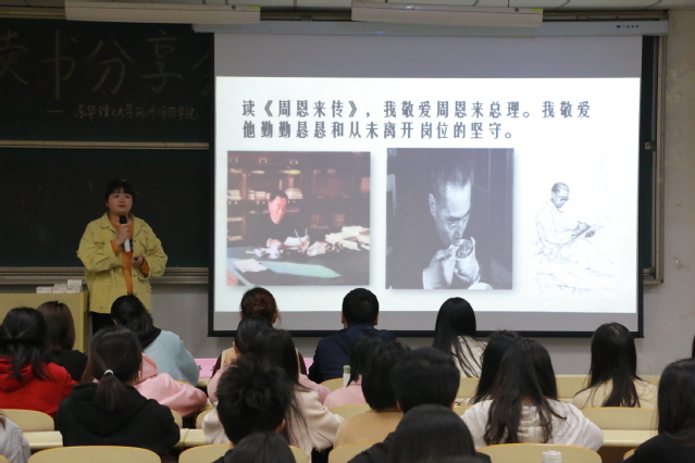 据悉,此次读书分享会是寒假期间我院开展的“三个一”读书活动的延续。会上,9位同学将自己假期所读红色经典著作内容及体会,跟在场的同学们进行了交流分享。其中,19级学前教育专业徐艳分享了《周恩来传》,让同学们深刻体悟“山河无恙盛世在,来日方长吾辈起”;19级汉语言专业张玉分享了《中共党史拐点中的人物与事件》,让历史从宏观变得更加具体,重温了改革时期的家国记忆;19级数学与应用数学专业邹子祎分享的《守望初心》用鲜活立体的人物、曲折动人的故事,向这片血染的土地以及曾经苦难的人民致敬;20级汉语言专业廖洁分享了《红色家书》,信中老一辈人的信念令人动容,向大家再现了百年红色情。同学们通过声情并茂的分享彰显了拳拳爱国心,浓浓赤子情。