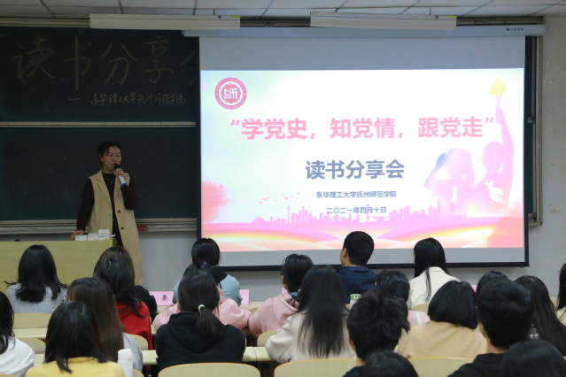 为扎实推进党史学习教育,传承红色基因,4月10日晚,抚州师范学院于二教阶十三教室组织开展以“学党史,知党情,跟党走”为主题的读书分享会活动。学团办老师郭佳磊、王小君出席了分享会。学院第六届团委、学生会主席团及我院2019级、2020级部分学生参加了此次活动。