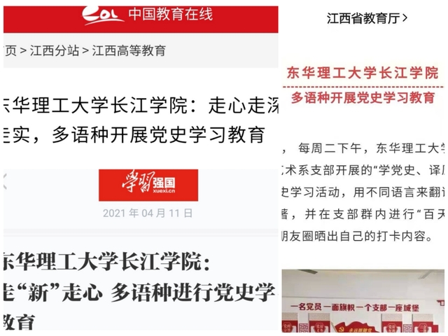 每周二下午,东华理工大学长江学院人文与艺术系党员活动室都回响着不同语言组合的郎朗读书声,2018级汉语国际教育专业学生葛佳欣、2018级英语专业学生温嘉莉、2019级日语专业学生张嘉伟分别用普通话、英语、日语朗读了《共产党宣言》《中国共产党简史》章节,支部书记丁文菁、盛丽芳、王彦老师进行纠音、朗读辅导,支部其他同学认真做着笔记,他们每个人手上都有一张满是语音词汇标注的翻译手稿。原来他们参加了支部开展的“学党史、译原著、颂党恩”党史学习活动,用不同语言来翻译、诵读党史原著,并在支部群内进行“百天线上打卡”,温嘉莉每次在朋友圈晒出自己的打卡内容,都能赢得不少的点赞和鼓励,这种新颖的学习方式,让党史学习教育一点也不枯燥。从3月开始,这种“专业实践方式”的党史学习在我系汉教、英语、日语学生支部中火热进行。