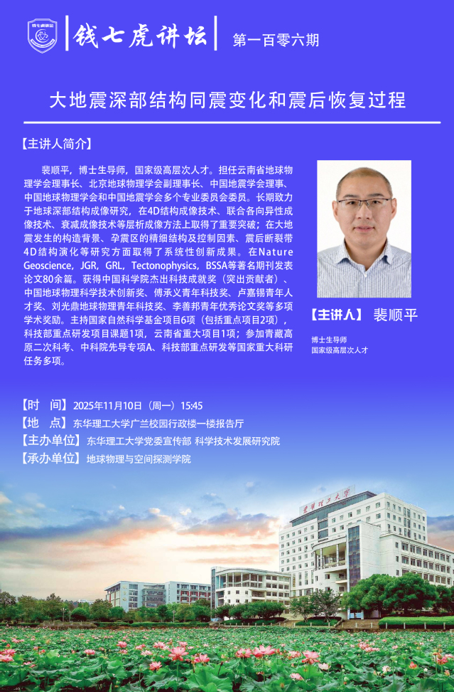 【钱七虎讲坛第一百零六期预告】大地震深部结构同震变化和震后恢复过程