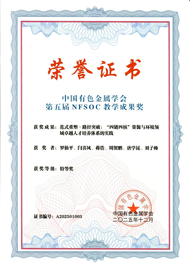 据悉,NFSOC教学成果计划是中国有色金属学会为推动有色金属领域高等教育教学改革与创新而设立的专项计划,旨在表彰和推广在教学实践、教学管理、教育研究等方面取得突出成绩的教学工作者和教育管理者。(文/闫喜凤 图/蒋浩)