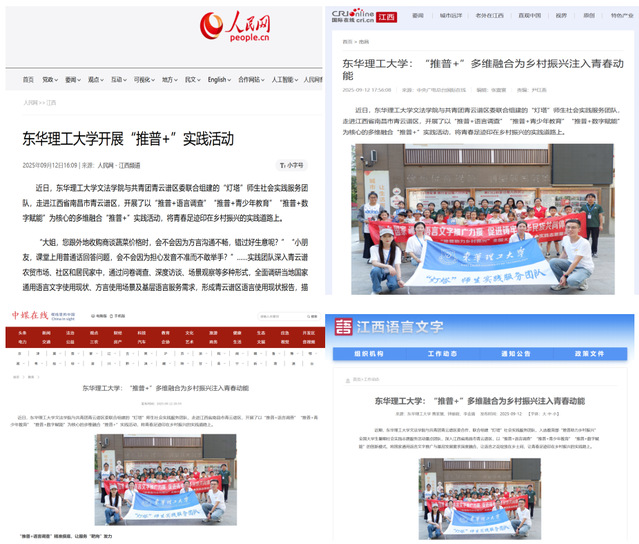 实践期间,由东华理工大学文法学院与共青团青云谱区委联合组建的“灯塔”师生社会实践服务团队,围绕国家通用语言文字推广与乡村振兴主题,深入青云谱区乡村社区、田间地头、文明实践中心及文化场馆,聚焦“推普+语言调查”“推普+青少年教育”“推普+数字赋能”三大方向,开展多维融合的“推普+”实践活动,着力提升青少年语言文化素养,切实以语言之力赋能乡村发展。活动受到群众广泛好评,并被人民网、国际在线、江西省教育厅官网等主流媒体宣传报道,取得良好社会反响。