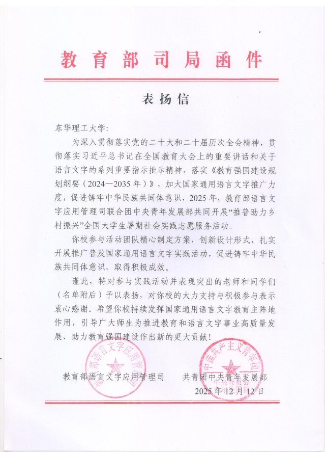 近日,2025年“推普助力乡村振兴”全国大学生暑期社会实践志愿服务活动评选结果揭晓。东华理工大学“灯塔”师生社会实践服务团队从全国2000余支参赛队伍中脱颖而出,获评“优秀团队”,并收到教育部语言文字应用管理司、共青团中央青年发展部联合签发的表扬信。信中肯定了学校师生在推广国家通用语言文字、服务乡村全面振兴过程中所付出的努力和取得的扎实成效。