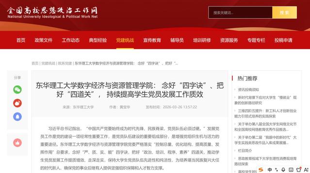 编者按:3月26日,全国高校思想政治工作网报道东华理工大学数字经济与资源管理学院念好“严、质、实、能”四字诀,把好“政治、培训、程序、素养”四道关,推动学生党员发展工作提质增效有关做法。现将相关报道转载如下: