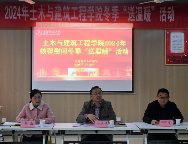 近日,随着气温逐渐走低,校园内却洋溢着阵阵暖意。12月20日,东华理工大学土木与建筑工程学院在创新创业学院104室(实训基地)积极开展“冬季送温暖”活动,为学子们驱散冬日的严寒。校党委常委、副校长李满根出席活动并讲话,学院党委书记李明东,学院党委副书记黄磊,学院学团办全体教师、受助学生代表共50余人参加活动。