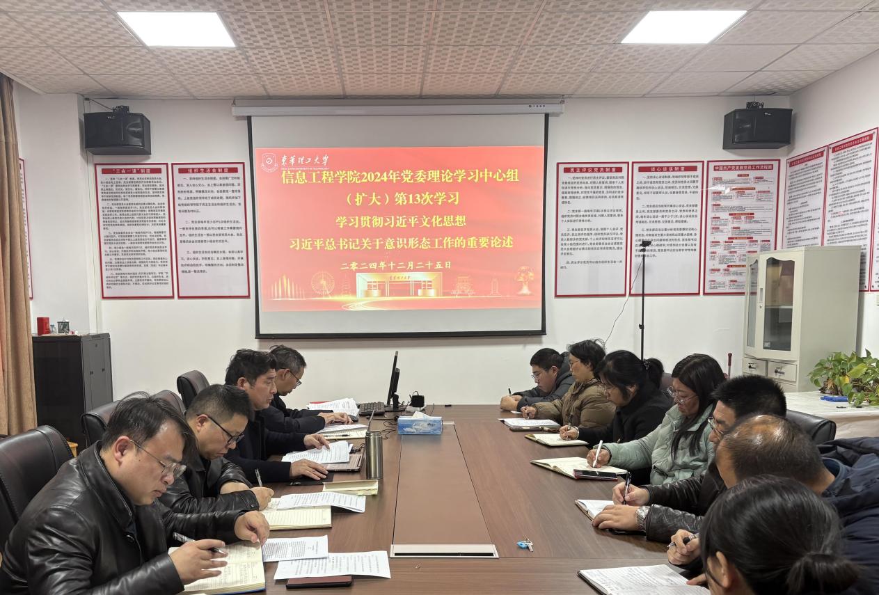 12月25日,学院党委在软件楼313召开理论学习中心组2024年第13次集体学习(扩大)会议。本次会议以“学习贯彻习近平文化思想、习近平总书记关于意识形态工作的重要论述”为主题,旨在深化全院党员干部对新时代文化建设和意识形态工作重要性的认识。学院党委书记王平风主持会议,党委班子成员、党委中心组(扩大)成员参加学习交流。