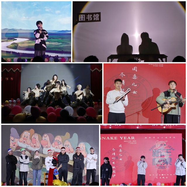 随后,由师生代表编排的系列舞蹈串烧展现出非凡的青春活力与热忱;钢琴独奏《平湖秋月》,清冷与柔美交织,将观众瞬间带入那如诗如画的西湖秋夜之境;歌曲《敕勒歌》带着现场观众仿佛穿越时空,驰骋于广袤无垠的敕勒大草原,感受着那份天地苍茫、水草丰美的豪迈与壮丽;幽默诙谐的小品《我们是杀手,却失了手》《白雪公主与七个大高个》《少爷和我》包袱抖落不断,让观众在阵阵欢笑中引发对生活真谛的深刻反思;原创灯影剧《我的大学生活》,灯光与影偶巧妙配合,在光影变换间,熟悉的校园场景逐一浮现,巧妙地引导同学们树立热爱学业、享受生活的生活理念。当熟悉的旋律《我记得》响起,晚会现场瞬间被一种别样的温情笼罩,为晚会注入了一丝丝浓浓的温情,让现场师生的心在辞旧迎新之际与往昔温柔相拥。