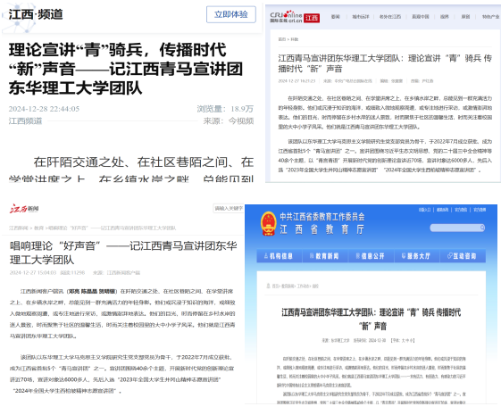 编者按:江西青马宣讲团东华理工大学团队自2022年成立以来,积极投身理论宣讲与实践探索,深入校园、社区等地,用青春之声传递党的声音,以实际行动践行青年使命,赢得了广泛赞誉,成为传播正能量、引领青年思潮的重要力量。国际在线、新华社客户端、中新媒以及中华新闻网等媒体对此进行报道,引发社会广泛关注,现将报道转载如下: