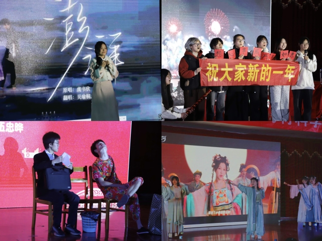 哑剧《城里人与乡下人》通过无声的肢体语言,生动描绘了城乡文化的差异与融合,幽默风趣的表演引得观众阵阵笑声,同时也引人深思。群舞《寄明月》和《华夏》则将观众带入了一个充满诗意与画意的世界,优美的舞姿与绚丽的舞台效果相结合,展现了中华文化的博大精深与民族自豪感。学生独唱环节,《不染》等歌曲各具特色,同学们用歌声讲述着不同的故事,展现了青春的多面性。小品《我们是杀手却失了手》和《喜迎元旦》以幽默诙谐的方式为晚会增添了更多欢乐,现场气氛热烈。院心联委带来的朗诵节目《闪耀吧青春的火花》,激昂而鼓舞人心,学生们用铿锵有力的声音传递了对青春的热爱与对未来的期许。院学生会的合唱《相亲相爱》,用和谐的歌声表达了对彼此的深厚情谊,传递了团结友爱的正能量。