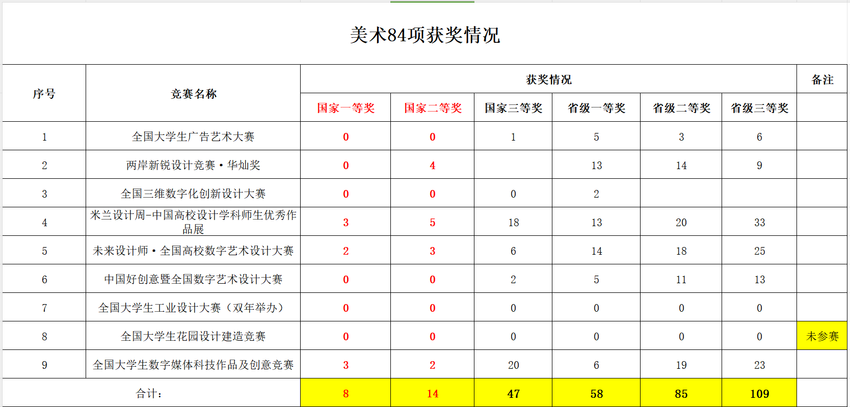 2024年美术与设计学院积极组织学生参加《全国普通高校大学生竞赛排行榜》目录内的8项竞赛,取得了优异成绩,共获奖321项。其中国家级69项(一等奖8项,二等奖14项,三等奖47项),省级252项(一等奖58项,二等奖85项,三等奖109项)。其中“2024米兰设计周-中国高校设计学科师生优秀作品展”获国家级一等奖3项,未来设计师·全国高校数字艺术设计大赛获国家级一等奖2项,全国大学生数字媒体科技作品及创意竞赛获国家级一等奖3 项。