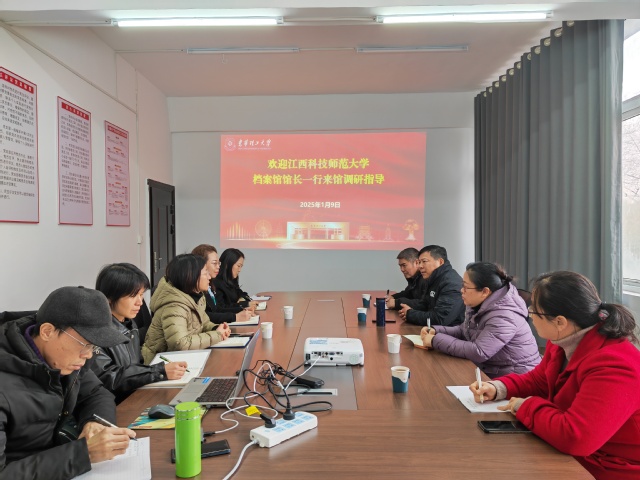 2025年1月9日,江西科技师范大学档案馆馆长张学文、副馆长吴灿龙一行4人来馆调研交流。档案馆负责人与各科室人员接待了来宾,并进行了座谈交流。